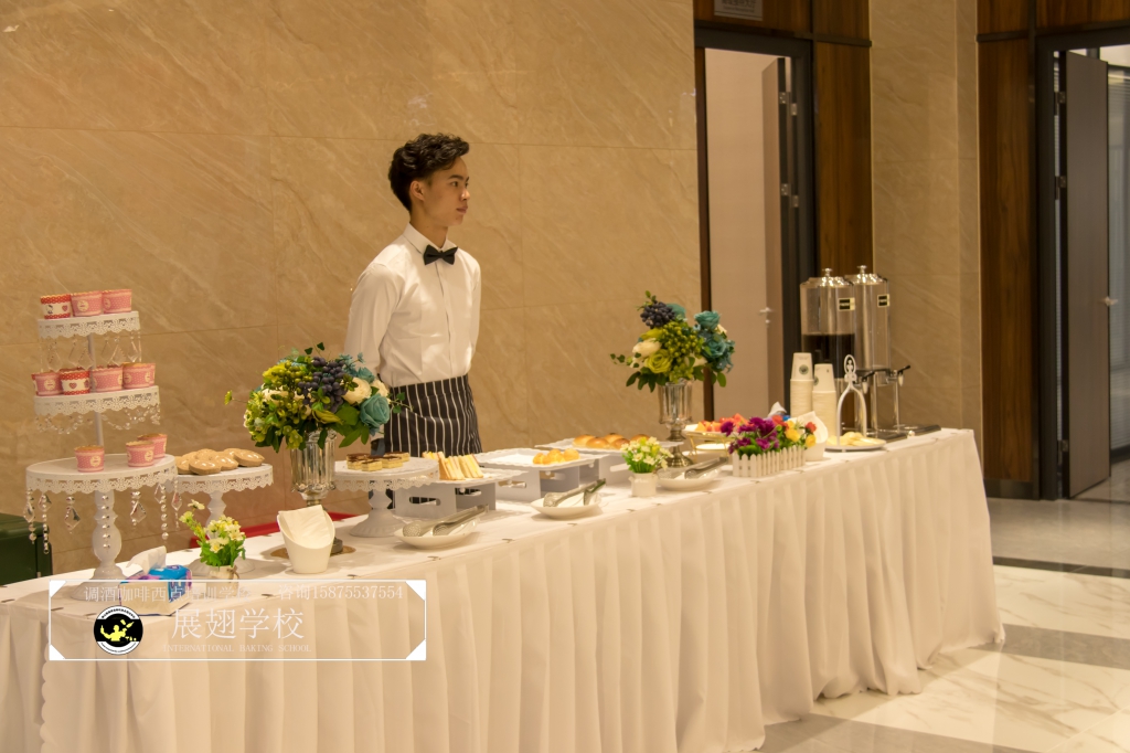 2018年4月20日,金滿堂企業開業典禮,佛山展翅調酒咖啡西點培訓學校的學員們為現場提供了精致美味的西點茶歇供大家享用,此次外出實踐活動,這樣可以檢驗學員這段時間以來的學習成果,還能讓學員親自體驗下西點服務行業的工作,還能提升自己的技術和能力。