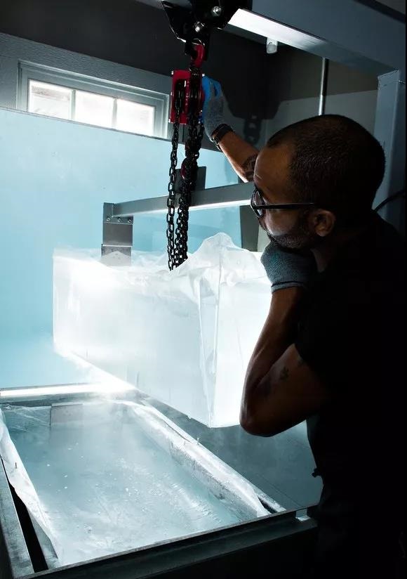 俗話說(shuō),冰凍三尺,非一日之寒。手鑿的冰塊取材自巨型冰板(block of ice),而制作它需要使用特殊的冰板制作儀(block ice machine)。冰板的制作通常要三至四天,在緩慢的冰凍過(guò)程中儀器需不斷攪拌,使水中的氣泡消失,直至冰塊完全純凈透明。沒(méi)有任何氣泡摻雜的冰塊有著更高的密度,稀釋速率也就隨之降低。