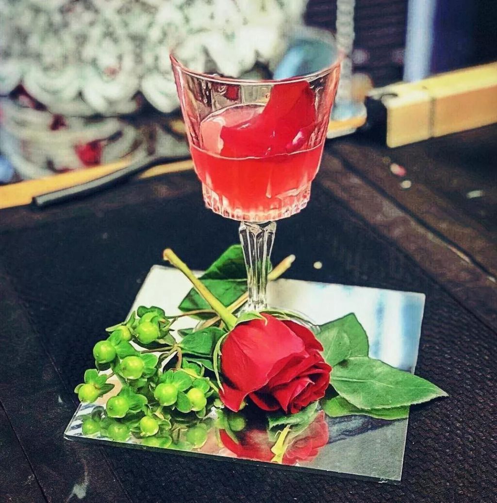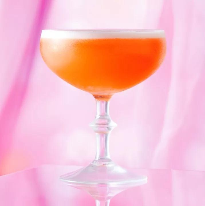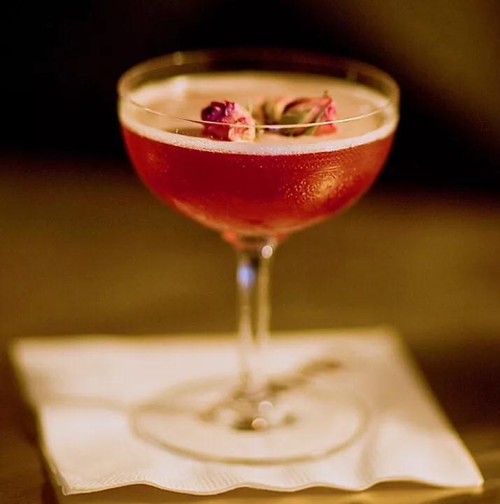做法:將苦精酒,檸檬汁和簡單的糖漿加入冰塊倒入搖杯中搖勻,濾入杯中,頂部倒入起泡酒,用紅色玫瑰花瓣裝飾,完成。