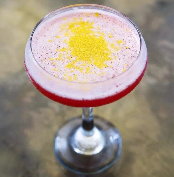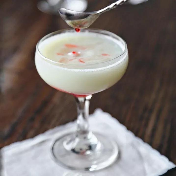 做法:將除了蘇打水之外的所有成分添加到搖壺中,并在沒有冰的情況下搖動20秒。加入幾塊碎冰塊,再搖一搖15秒濾入雞尾酒杯,緩緩加入蘇打水,淋上櫻桃汁。