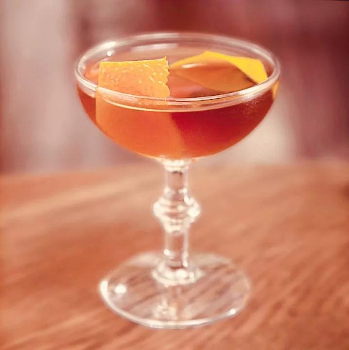 做法:將所有預料與冰塊加入混合玻璃杯中,攪拌濾入杯中,橙皮在杯口擦拭一圈后裝飾。