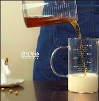 1、首先在杯底放入豆酪,在牛奶里倒入港紅茶湯,倒入黃金果糖,攪拌均勻,然后往出品杯中放入冰塊,然后將奶茶倒入杯子里。