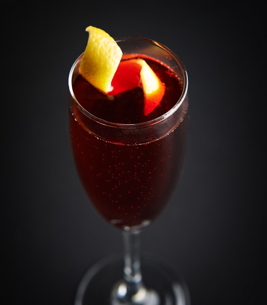 *在酒吧烘烤釋放香味將葡萄酒外所有的食材搖勻,伴隨桃紅起泡酒倒入一個香檳杯中,用擰過的檸檬皮扭進行裝飾